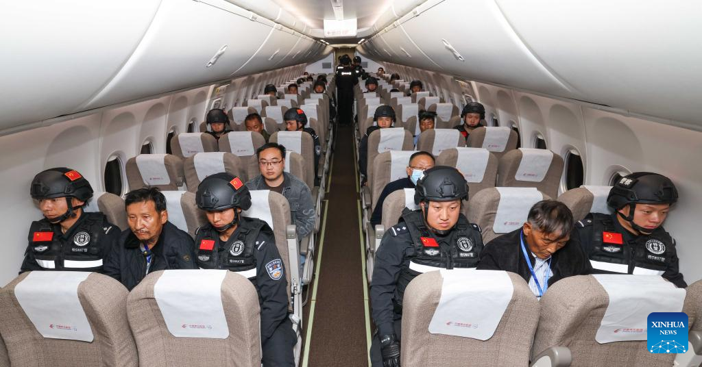 Criminal suspects escorted by Chinese police officers are pictured on a charter flight to China, Jan. 30, 2024. The Myanmar police on Tuesday handed six key leaders of Kokang telecom fraud gangs and four other major criminal suspects over to China, according to China's Ministry of Public Security.?(Xinhua/Yin Gang)