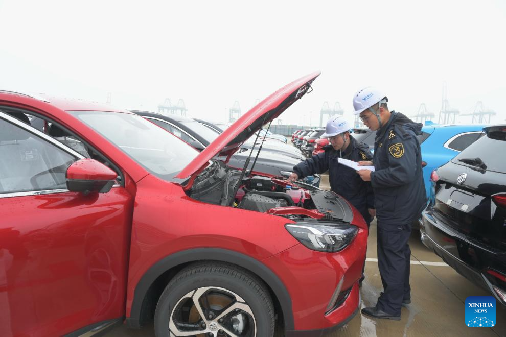 Staff members of China Customs verify hybrid vehicles for export at Jiangyin terminal of Fuzhou Port in southeast China's Fujian Province, Jan. 30, 2024. (Xinhua/Lin Shanchuan)