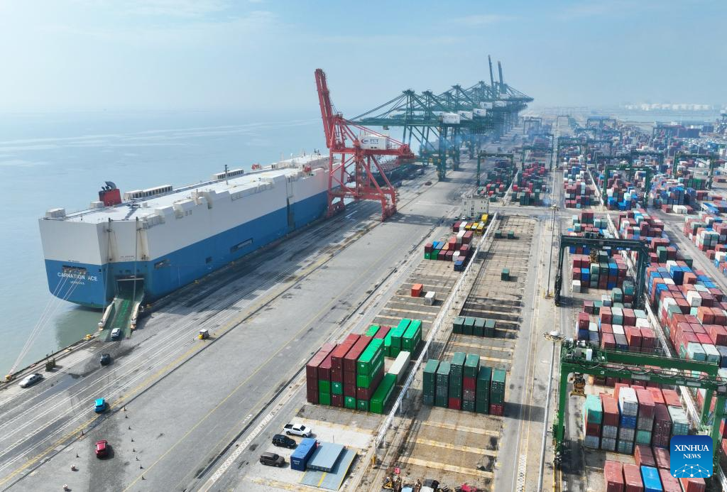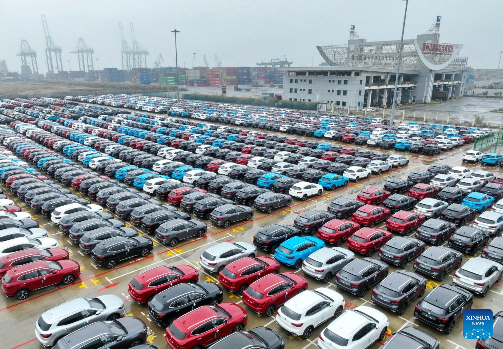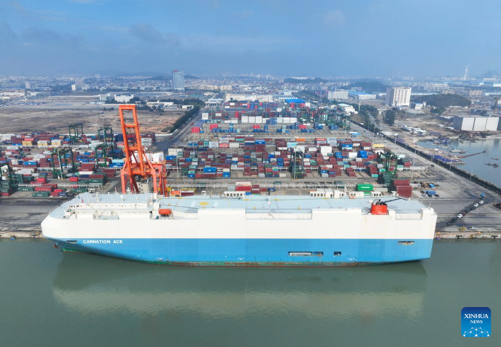 Vehicles for export are loaded into a ro-ro cargo vessel at Jiangyin terminal of Fuzhou Port in southeast China's Fujian Province, Jan. 30, 2024. (Xinhua/Lin Shanchuan)