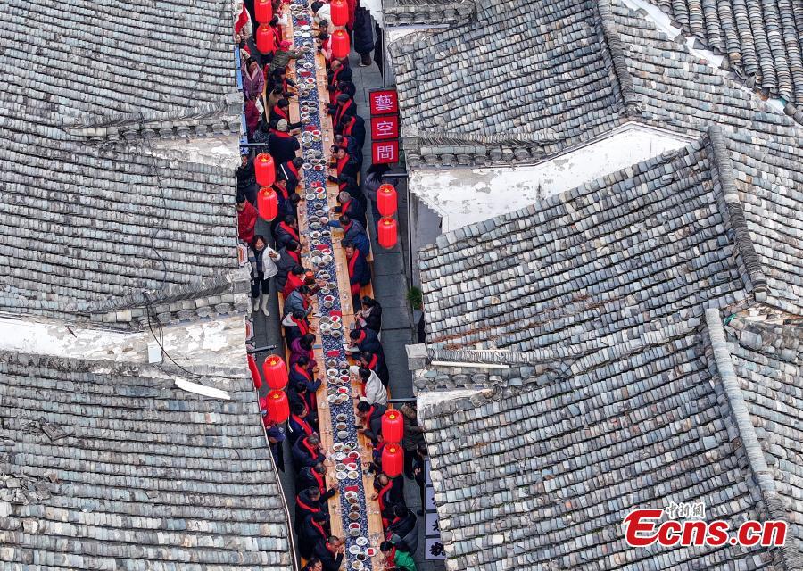 Tourists enjoy a long-table banquet along a street in Huangshan city, east China's Anhui Province, Jan. 30, 2024. (Photo: China News Service/Shi Yalei)