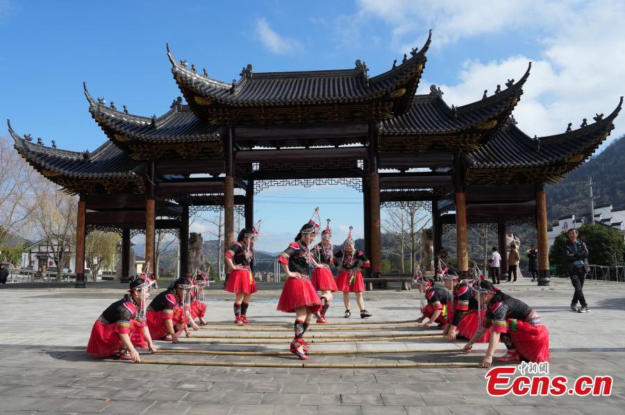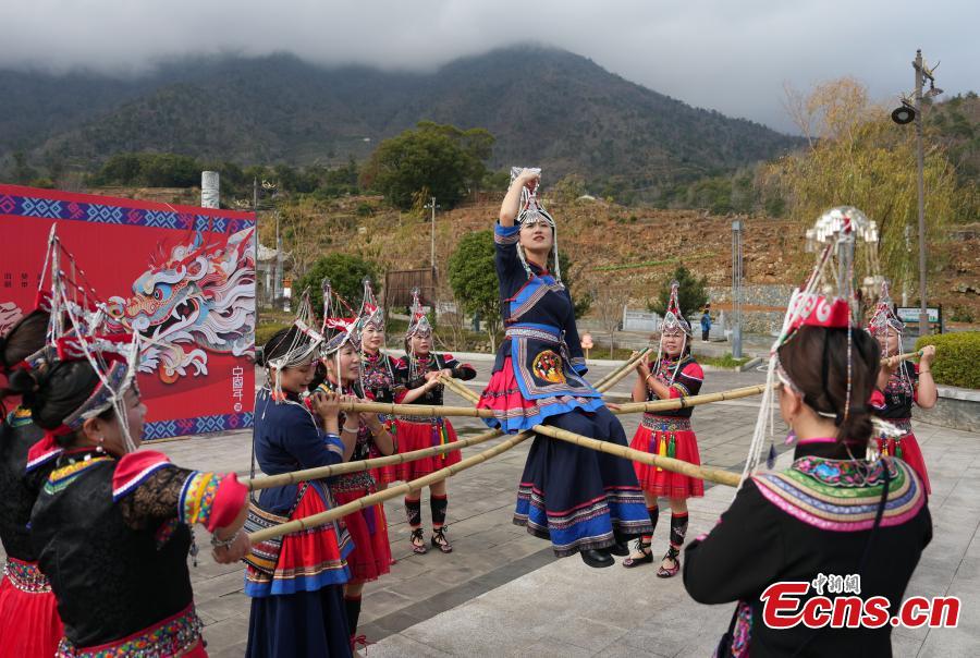 Women of She ethnic group in traditional costumes participate in a bamboo dance for a local Spring Festival gala at Cangnan County of Wenzhou City, east China's Zhejiang Province, Jan. 30, 2024. (Photo: China News Service/Mao Jianjun)