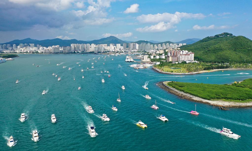 An aerial drone photo taken on Oct. 1, 2023 shows tourists going sailing in Sanya, south China's Hainan Province. (Xinhua/Guo Cheng)