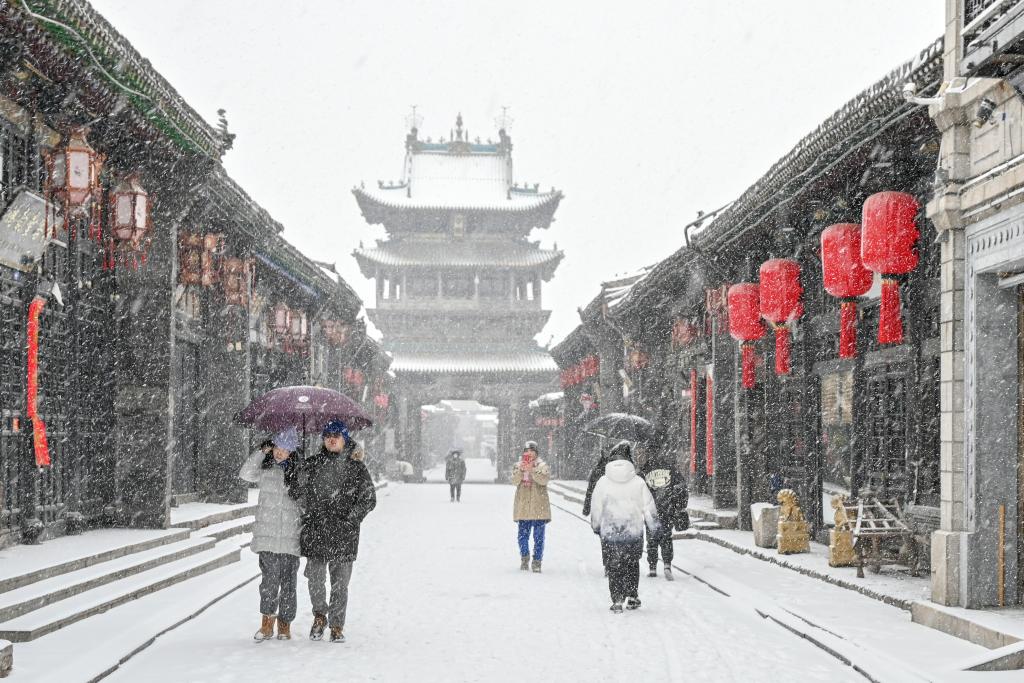 Tourists visit Pingyao ancient city amid falling snow in north China's Shanxi Province, Dec. 14, 2023. (Photo by Liang Shengren/Xinhua)