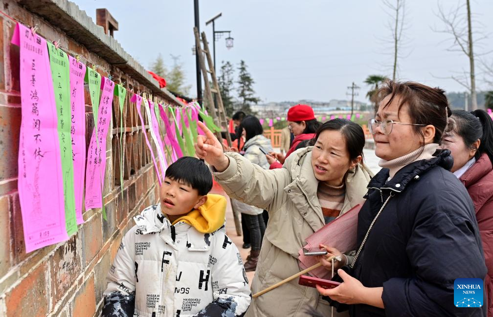 Tourists take part in a riddle-guessing game to welcome the Spring Festival in Fuzhou, east China's Jiangxi Province, Jan. 31, 2024. People across China are preparing for the upcoming Spring Festival, the biggest occasion for family reunions, and heralds the beginning of spring. (Photo by Deng Xingdong/Xinhua)