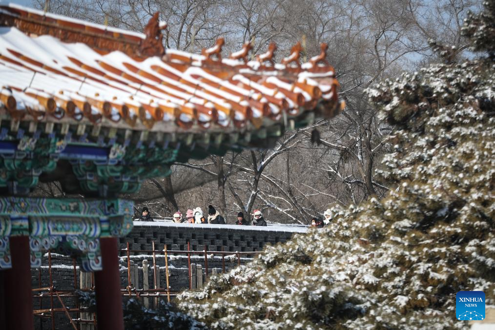 People visit the Beiling Park after a snowfall in Shenyang, northeast China's Liaoning Province, Jan. 31, 2024. (Xinhua/Pan Yulong)