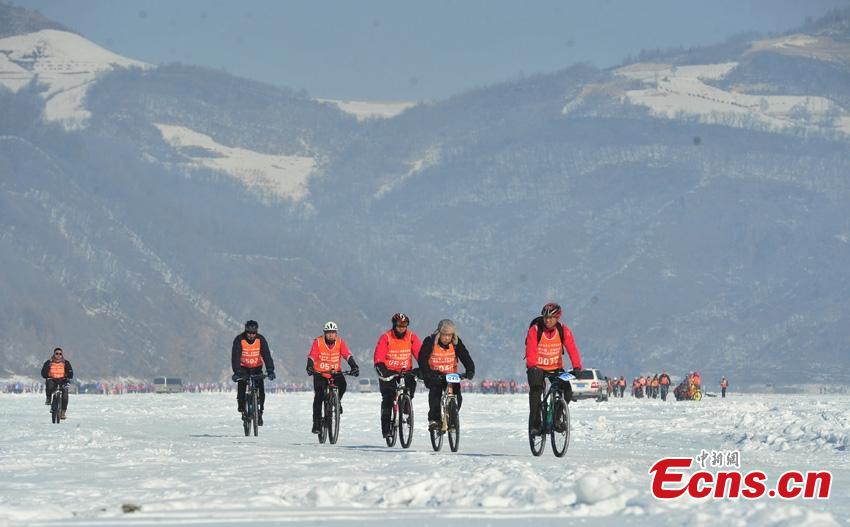 Cyclist ride on the snow during the first China Jilin Songhua River Ice Skating Marathon in Jingyu County of Baishan City in northeast China's Jilin Province, Jan. 30, 2024, marking a new Guinness World Record for the largest ice skating race series. (Photo: China News Service/Gao Long'an)