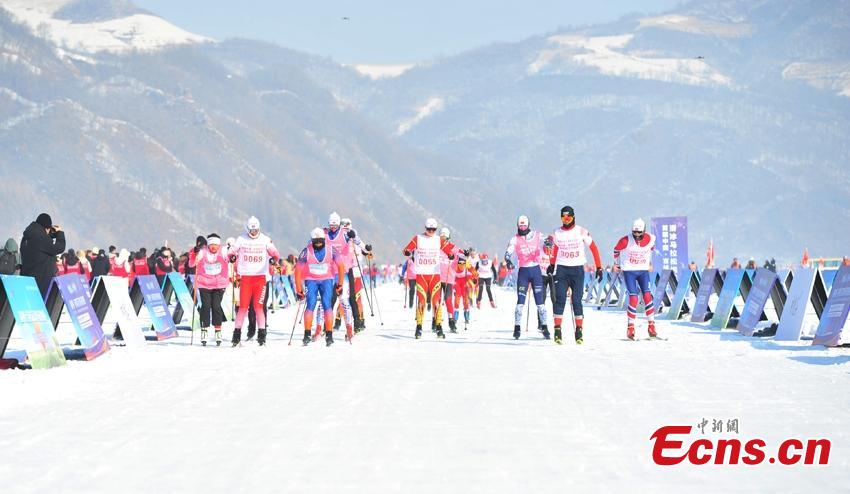 Racers compete in the skiing competition during the first China Jilin Songhua River Ice Skating Marathon in Jingyu County of Baishan City in northeast China's Jilin Province, Jan. 30, 2024, marking a new Guinness World Record for the largest ice skating race series. (Photo: China News Service/Gao Long'an)