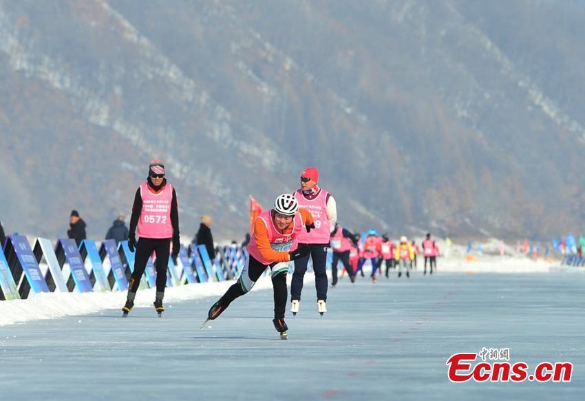About 7,000 skaters gathered at the frozen Songhuajiang River, clinching the record and 808 participants completed the ice skating marathon in Jingyu county of Baishan city in Northeast China's Jilin province on Tuesday.