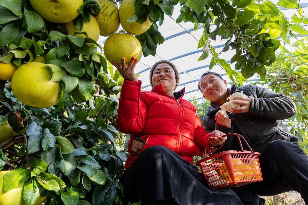 Citizens pick grapefruits in a demonstration agricultural park in Zhangye, northwest China's Gansu province. Local authorities, by combining featured agriculture with sightseeing, have helped farmers increase their income. (People's Daily Online/Yang Xiao)