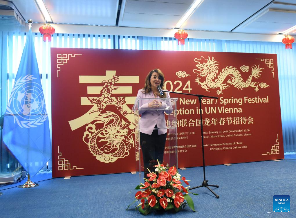 Ghada Waly, director-general of the United Nations (UN) Office at Vienna, speaks during a reception to celebrate the Spring Festival at Vienna International Center in Vienna, Austria, Jan. 31, 2024. A reception in celebration of the Spring Festival, co-hosted by China's Permanent Mission to the UN in Vienna and UN Vienna Chinese Culture Club, was held here on Wednesday. It was the first such event staged at the UN Office at Vienna by the permanent mission. (Xinhua/He Canling)
