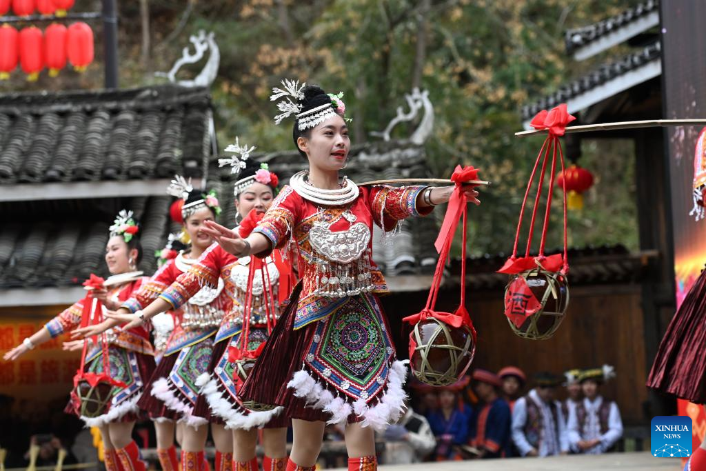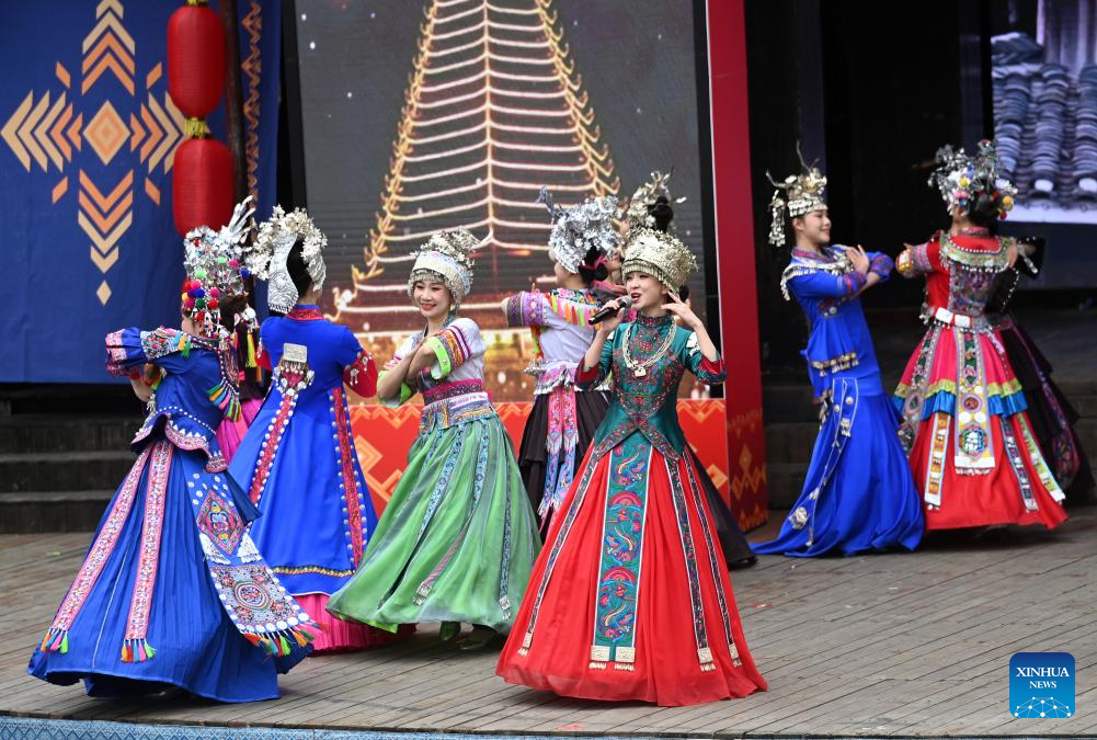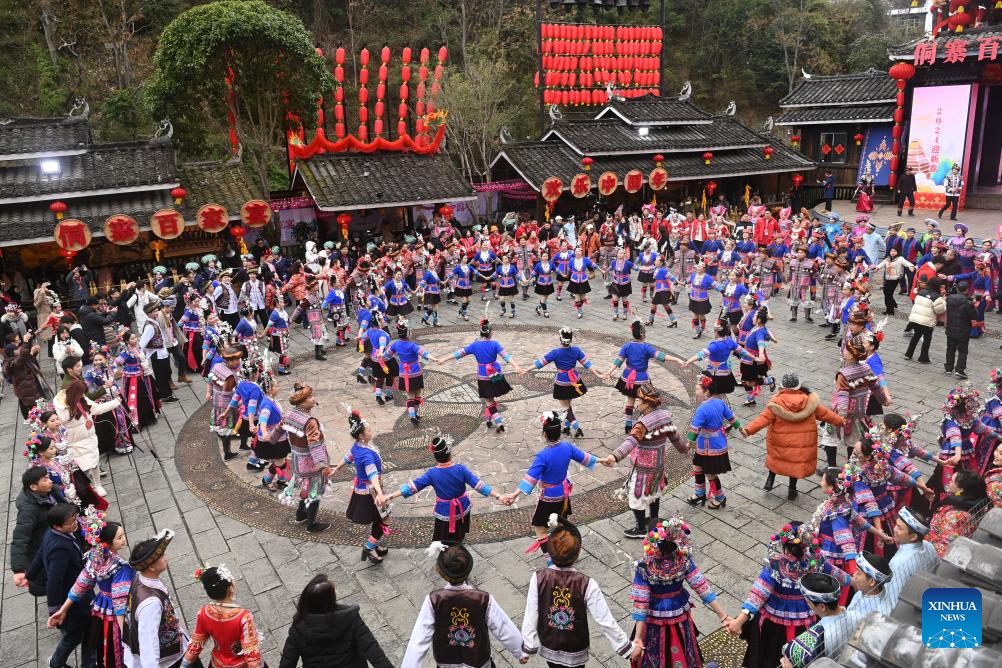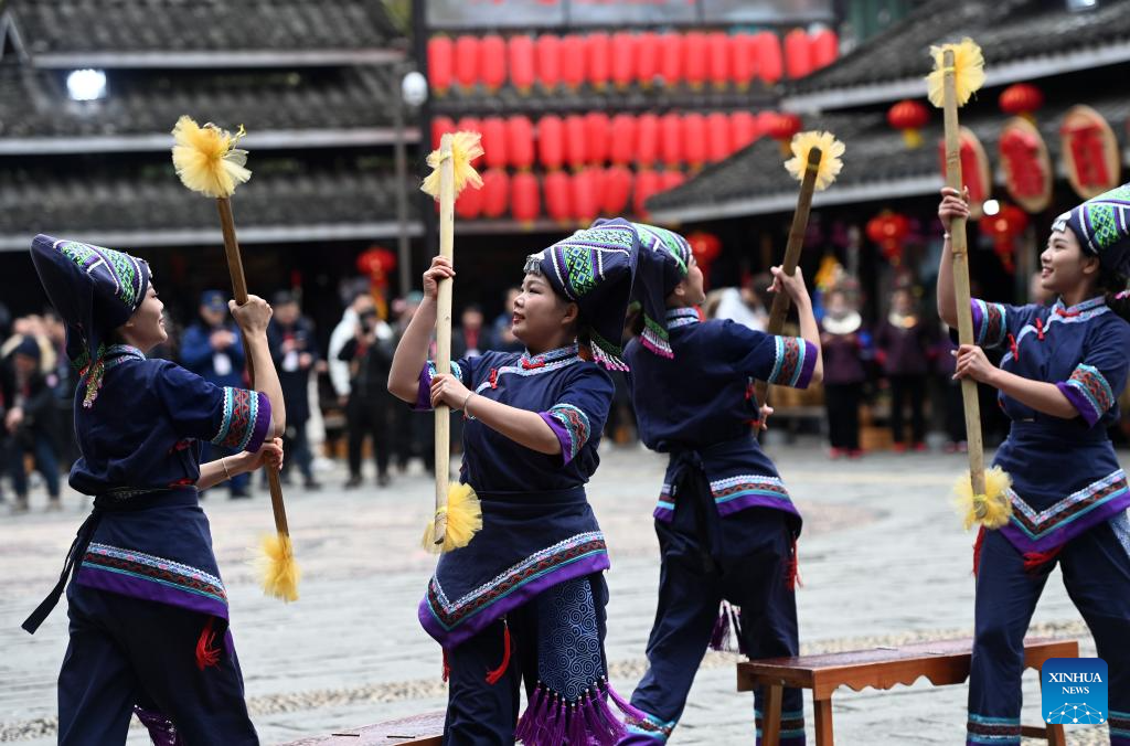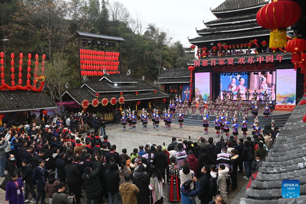 People perform during the "village gala" at a scenic spot in Sanjiang Dong Autonomous County, Liuzhou City of south China's Guangxi Zhuang Autonomous Region, Feb. 3, 2024. More than 1,200 people from 22 performing teams across Guangxi participated in the "village gala" to celebrate the upcoming Spring Festival. (Xinhua/Lu Boan)
