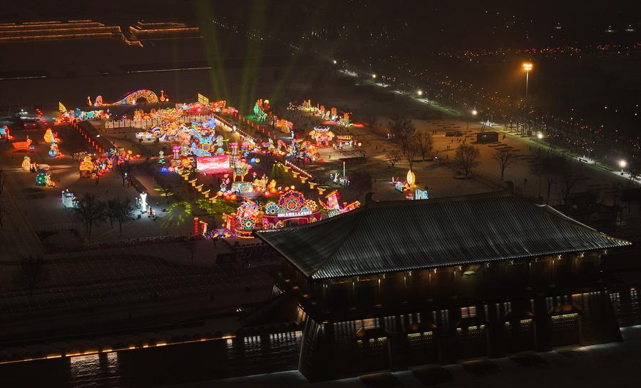 An aerial drone photo taken on Feb. 2, 2024 shows light decorations at the Tang Paradise, a complex based on the site of the original relic of an imperial garden dating back to the Tang Dynasty (618-907), in Xi'an, capital of northwest China's Shaanxi Province. (Xinhua/Shao Rui)