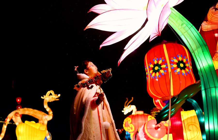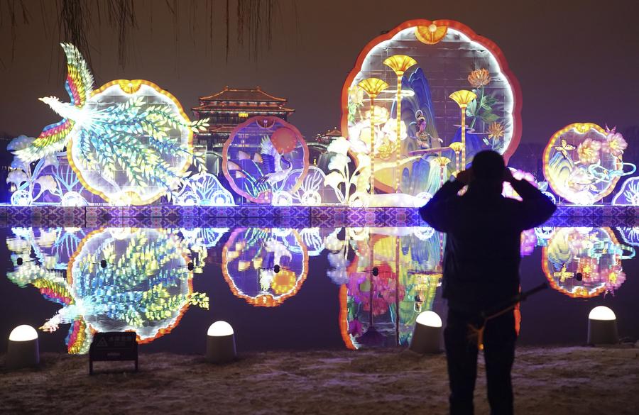 A tourist looks at light decorations at the Tang Paradise, a complex based on the site of the original relic of an imperial garden dating back to the Tang Dynasty (618-907), in Xi'an, capital of northwest China's Shaanxi Province, Feb. 2, 2024. (Xinhua/Shao Rui)