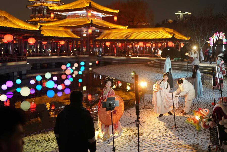Tourists pose for photos at the Tang Paradise, a complex based on the site of the original relic of an imperial garden dating back to the Tang Dynasty (618-907), in Xi'an, capital of northwest China's Shaanxi Province, Feb. 2, 2024. (Xinhua/Shao Rui)