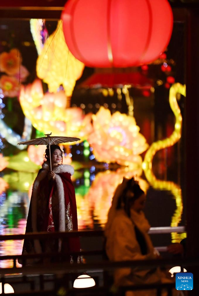 A tourist poses for photos at the Tang Paradise, a complex based on the site of the original relic of an imperial garden dating back to the Tang Dynasty (618-907), in Xi'an, capital of northwest China's Shaanxi Province, Feb. 2, 2024. The 2024 Chang'an Light Show started in Xi'an on Friday. Thousands of lights and lanterns decorated many places of interests in the city, including the city wall, the Tang Paradise complex and the Daming Palace National Heritage Park. (Xinhua/Li Yibo)