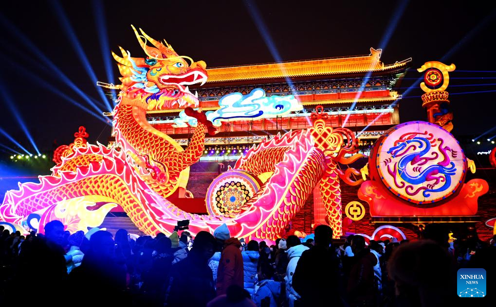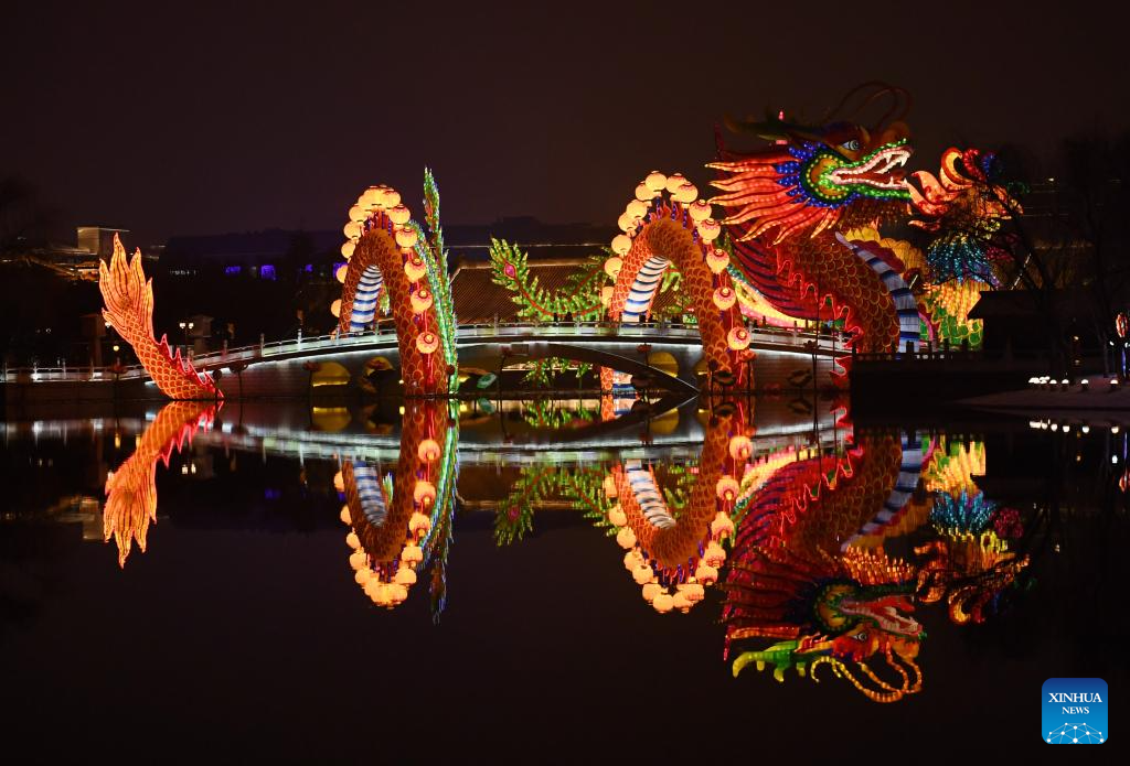 Light decorations are seen at the Daming Palace National Heritage Park in Xi'an, capital of northwest China's Shaanxi Province, Feb. 2, 2024. The 2024 Chang'an Light Show started in Xi'an on Friday. Thousands of lights and lanterns decorated many places of interests in the city, including the city wall, the Tang Paradise complex and the Daming Palace National Heritage Park. (Xinhua/Zhang Bowen)