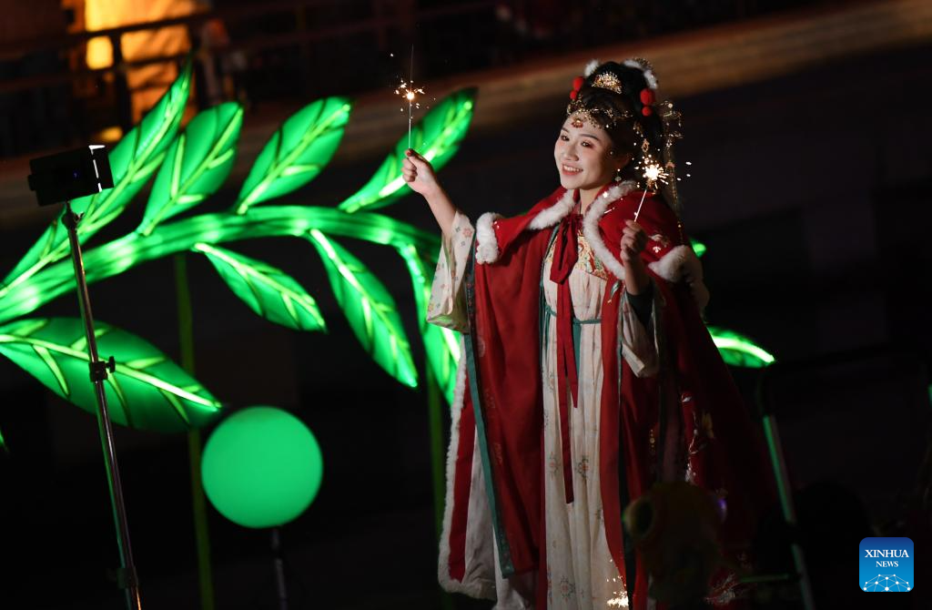 A light decoration is seen at the Tang Paradise, a complex based on the site of the original relic of an imperial garden dating back to the Tang Dynasty (618-907), in Xi'an, capital of northwest China's Shaanxi Province, Feb. 2, 2024. The 2024 Chang'an Light Show started in Xi'an on Friday. Thousands of lights and lanterns decorated many places of interests in the city, including the city wall, the Tang Paradise complex and the Daming Palace National Heritage Park. (Xinhua/Li Yibo)