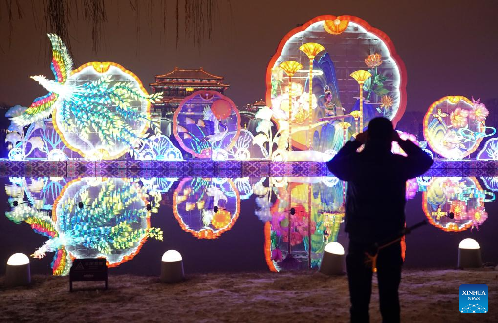 A tourist looks at light decorations at the Tang Paradise, a complex based on the site of the original relic of an imperial garden dating back to the Tang Dynasty (618-907), in Xi'an, capital of northwest China's Shaanxi Province, Feb. 2, 2024. The 2024 Chang'an Light Show started in Xi'an on Friday. Thousands of lights and lanterns decorated many places of interests in the city, including the city wall, the Tang Paradise complex and the Daming Palace National Heritage Park. (Xinhua/Shao Rui)