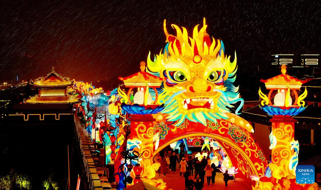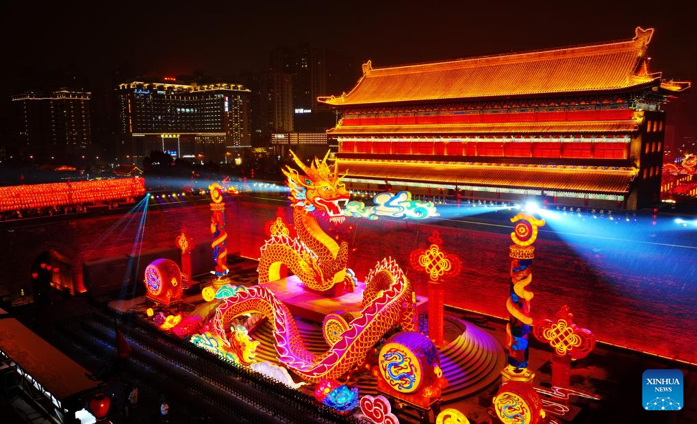 A drone photo taken on Feb. 2, 2024 shows light decorations near the city wall of Xi'an, capital of northwest China's Shaanxi Province. The 2024 Chang'an Light Show started in Xi'an on Friday. Thousands of lights and lanterns decorated many places of interests in the city, including the city wall, the Tang Paradise complex and the Daming Palace National Heritage Park. (Xinhua/Liu Xiao)