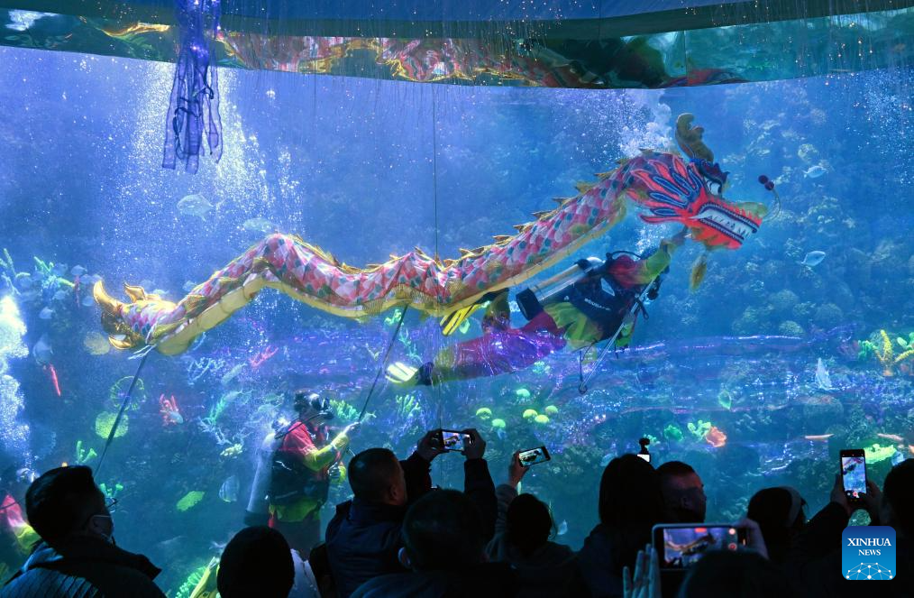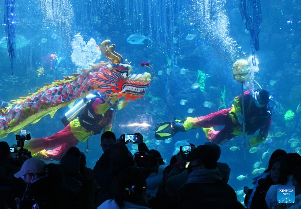 Tourists watch underwater dragon dance performance at Qingdao Polar Ocean Park in Qingdao, east China's Shandong Province, Feb. 3, 2024. The underwater dragon dance was staged to celebrate the upcoming Chinese Lunar New Year of the Dragon. (Xinhua/Li Ziheng)