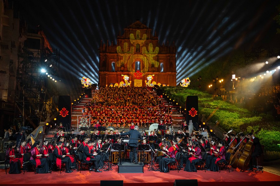 MACAO, Feb. 4 (Xinhua) -- The 2024 Happy Chinese New Year launch ceremony and a concert took place on Saturday at the square in front of the Ruins of St. Paul's, a world heritage in Macao.