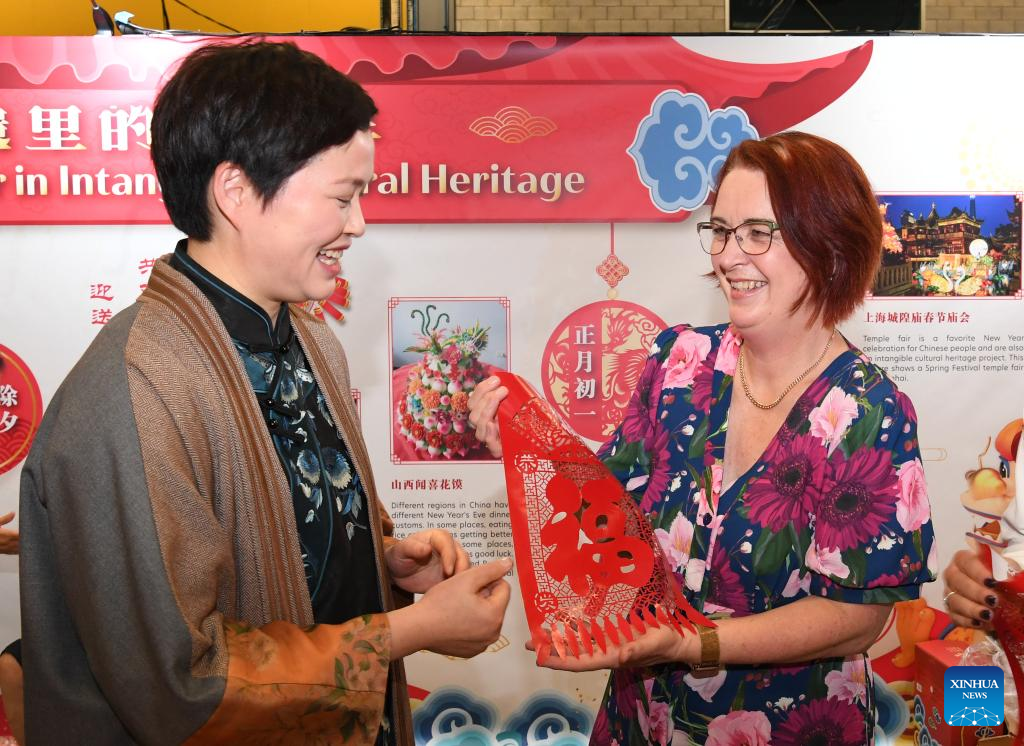 A resident (R) receives a paper-cutting work showing the Chinese character "Fu (fortune)" on the Chinese New Year Festival and Market Day in Auckland, New Zealand, Feb. 3, 2024. The Auckland Showgrounds burst forth with color and festivity on Saturday with the opening of the Chinese New Year Festival and Market Day, a signature event that has become a long-cherished tradition for various communities in New Zealand. (Xinhua/Guo Lei)