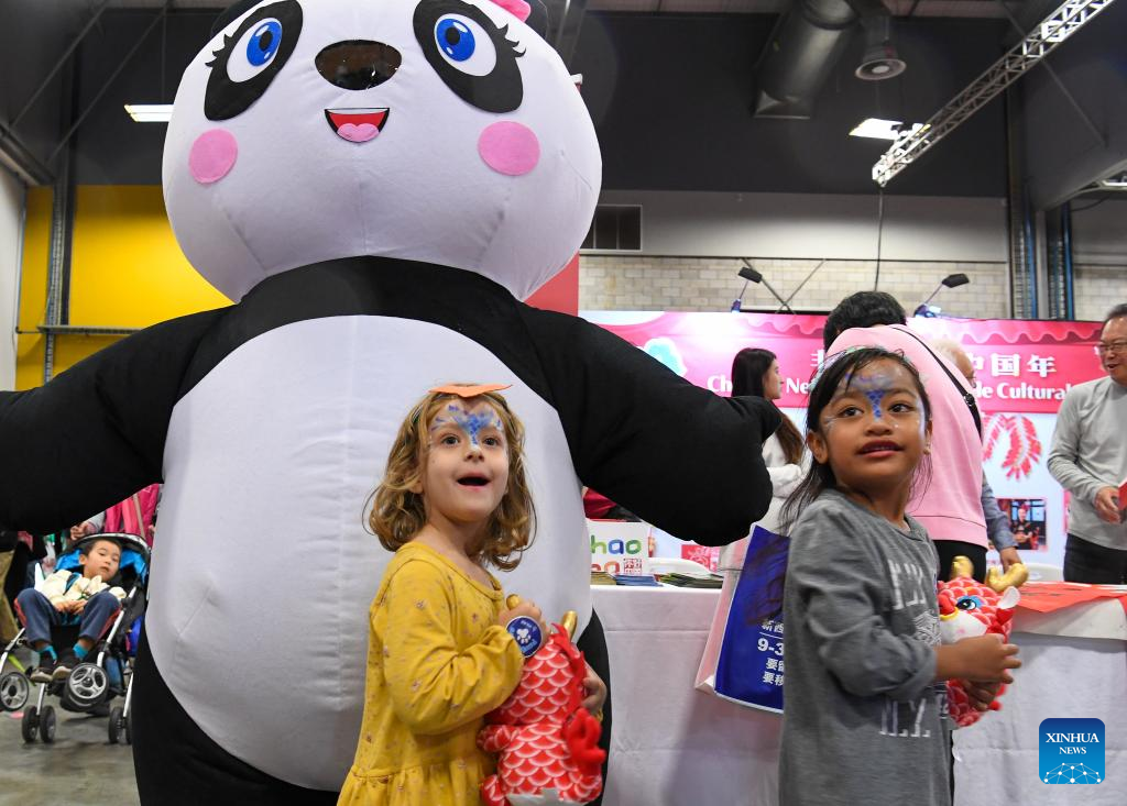 Children walk past a panda figure on the Chinese New Year Festival and Market Day in Auckland, New Zealand, Feb. 3, 2024. The Auckland Showgrounds burst forth with color and festivity on Saturday with the opening of the Chinese New Year Festival and Market Day, a signature event that has become a long-cherished tradition for various communities in New Zealand. (Xinhua/Guo Lei)