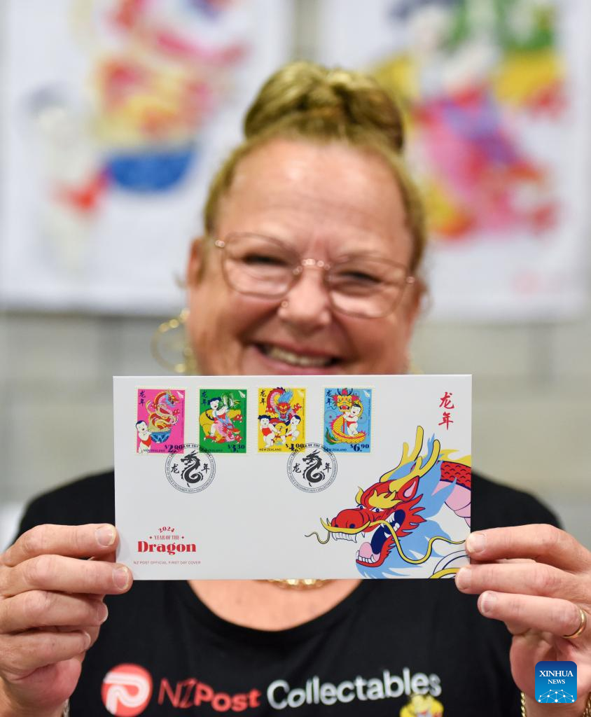 A staff member of New Zeland Post shows Year of the Dragon stamps on the Chinese New Year Festival and Market Day in Auckland, New Zealand, Feb. 3, 2024. The Auckland Showgrounds burst forth with color and festivity on Saturday with the opening of the Chinese New Year Festival and Market Day, a signature event that has become a long-cherished tradition for various communities in New Zealand. (Xinhua/Guo Lei)