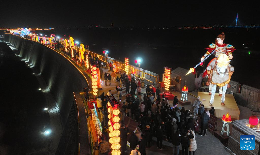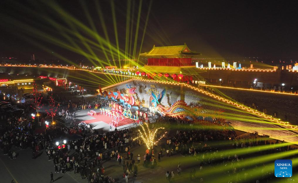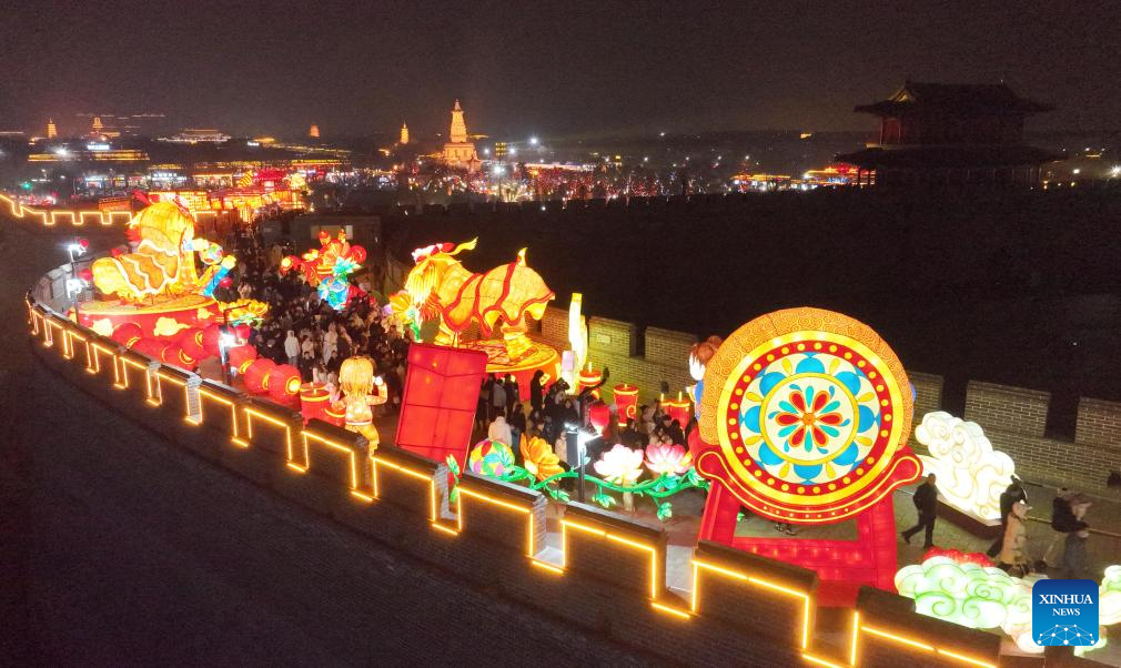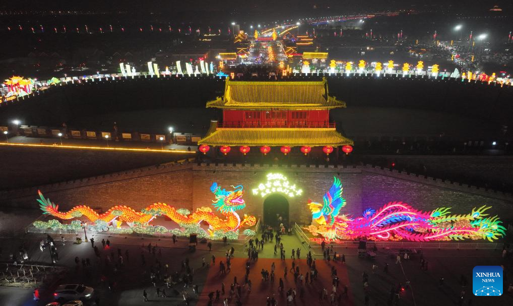 A drone photo shows people visiting a lantern show at the Zhengding ancient city in Shijiazhuang, north China's Hebei Province, Feb. 3, 2024. The lantern show to greet the upcoming Spring Festival displays local festival and folk culture, and the history of the ancient city. (Xinhua/Mu Yu)
