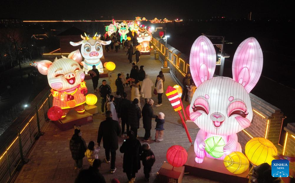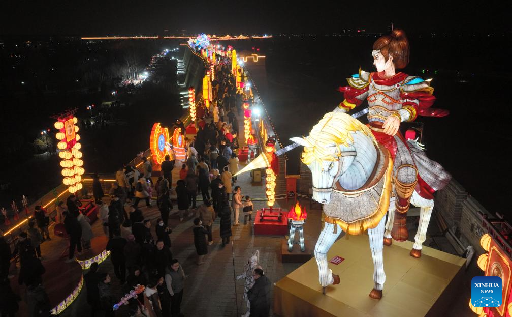 This photo shows a view of a lantern show at the Zhengding ancient city in Shijiazhuang, north China's Hebei Province, Feb. 3, 2024. The lantern show to greet the upcoming Spring Festival displays local festival and folk culture, and the history of the ancient city. (Xinhua/Mu Yu)