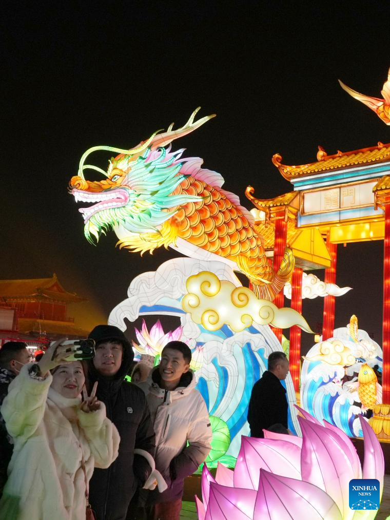 Visitors take a selfie during a lantern show at the Zhengding ancient city in Shijiazhuang, north China's Hebei Province, Feb. 3, 2024. The lantern show to greet the upcoming Spring Festival displays local festival and folk culture, and the history of the ancient city. (Xinhua/Mu Yu)