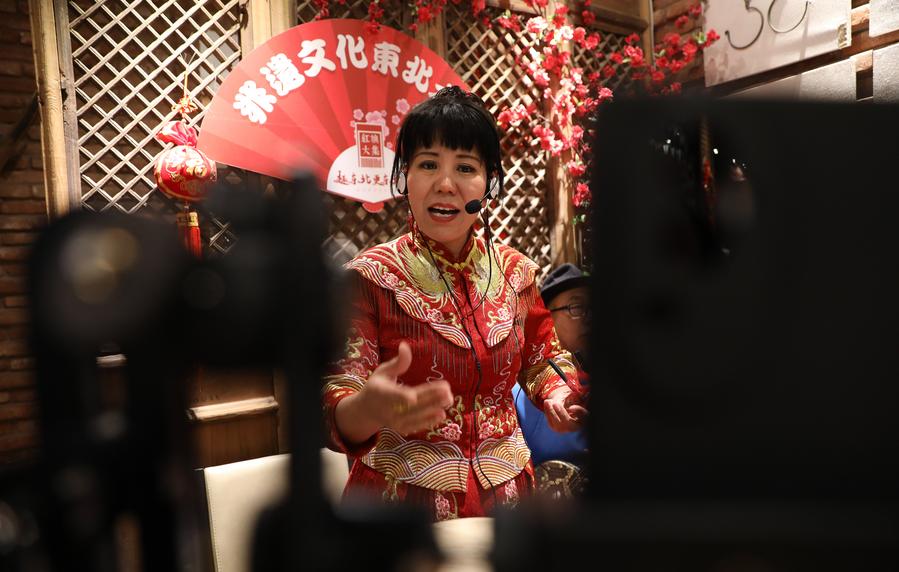 Wang Yanjuan stages a "Dongbei Dagu" show via livestreaming at a shopping mall in Yingkou, northeast China's Liaoning Province, Feb. 1, 2024. (Xinhua/Yao Jianfeng)