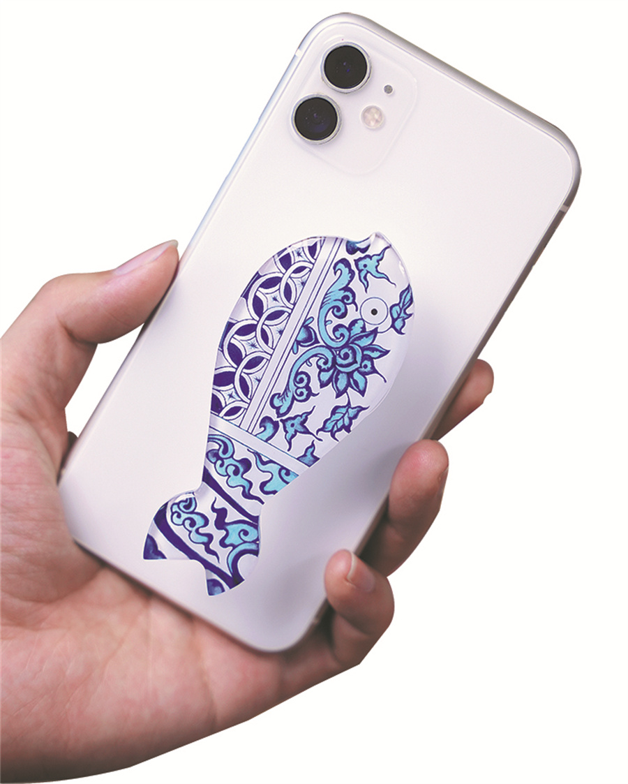 A phone holder, designed by Su Dayou in Beijing, has blue-and-white porcelain designs. [CHINA DAILY]
