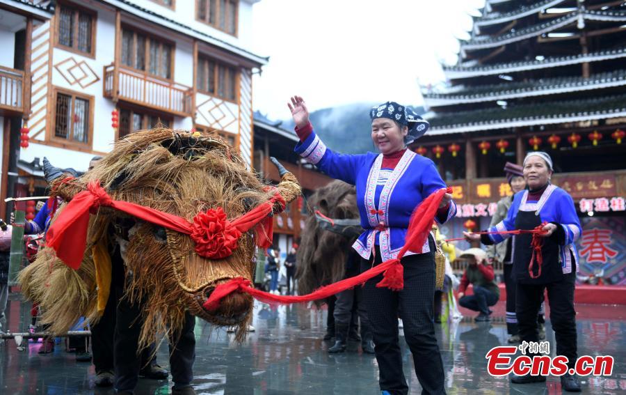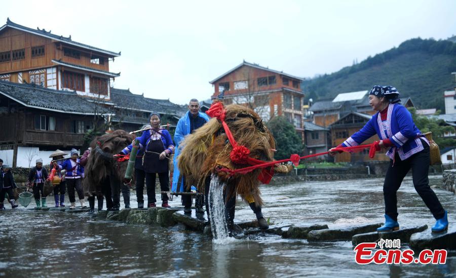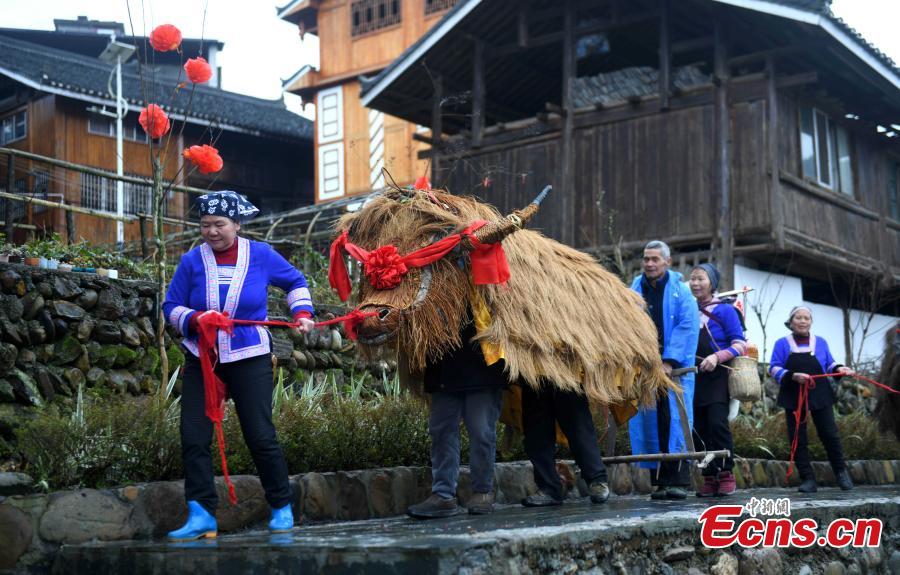 People take part in a straw cattle parade, a traditional cultural event to pray for a good harvest in the coming new year on Lichun, the beginning of spring, the first of the 24 solar terms in Chinese lunar calendar, in Guangnan Village of Guilin City, south China's Guangxi Zhuang Autonomous Region, Feb. 4, 2024. (Photo: China News Service/Pan Zhixiang)