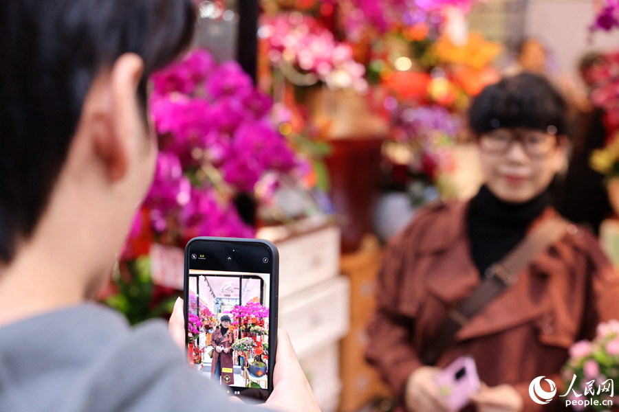 Visitors take pictures with colorful flowers at a flower market in Xiamen city, southeast China's Fujian province. (People's Daily Online/Chen Bo)