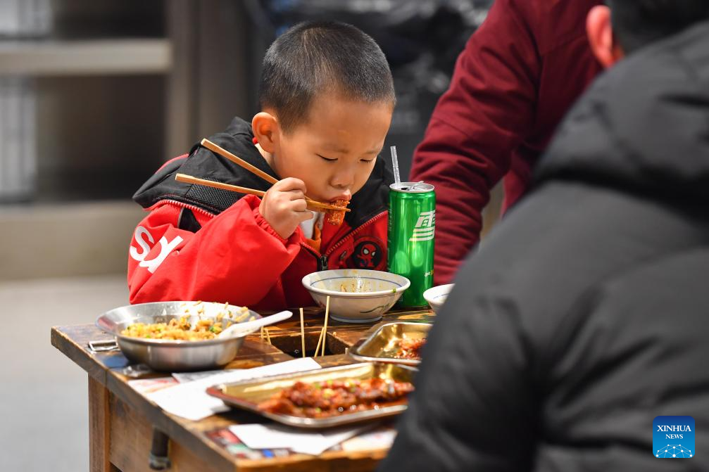 A child dines at a stall in a night market selling street food in Changsha, central China's Hunan Province, Feb. 4, 2024. To attract more visitors, stalls in this night market are making innovations such as developing new products and promoting via social media. (Xinhua/Chen Zeguo)