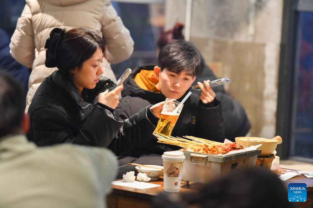 People dine at a stall in a night market selling street food in Changsha, central China's Hunan Province, Feb. 4, 2024. To attract more visitors, stalls in this night market are making innovations such as developing new products and promoting via social media. (Xinhua/Chen Zeguo)