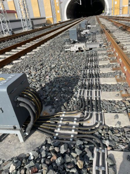 This photo shows snow-melting devices at turnouts. [Photo/Chengdu-Lanzhou railway project department of China Railway Electrification Bureau Group]
