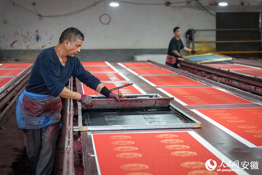 Workers make Spring Festival couplets paper at a factory in Dingjiaqiao township, Jingxian county, east China's Anhui Province. (People's Daily Online/Miao Zijian)
