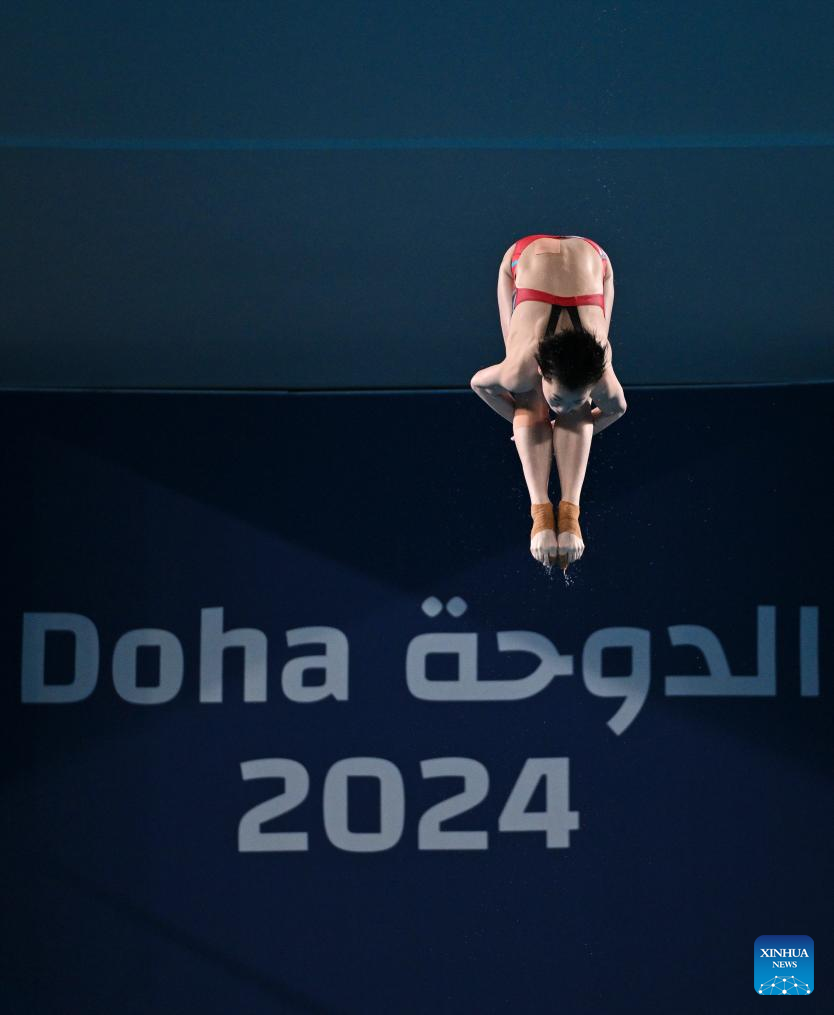 Quan Hongchan of China competes during the women's 10m platform final of diving at the World Aquatics Championships 2024 in Doha, Qatar, Feb. 5, 2024. (Xinhua/Luo Yuan)