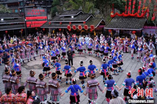 Photo shows the Dong people dancing at the Chengyang Bazhai Scenic Area in Sanjiang Dong Autonomous County, Liuzhou city of south China's Guangxi Zhuang Autonomous Region. (Chinanews.com/Liu Juncong)