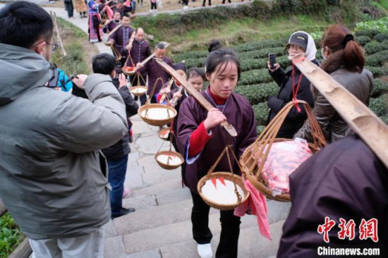 Dong ethnic group people were escorting well-dressed brides back to their mothers' homes in the Chengyang Bazhai Scenic Area in Sanjiang Dong Autonomous County, Liuzhou city of south China's Guangxi Zhuang Autonomous Region, on Feb. 3.
