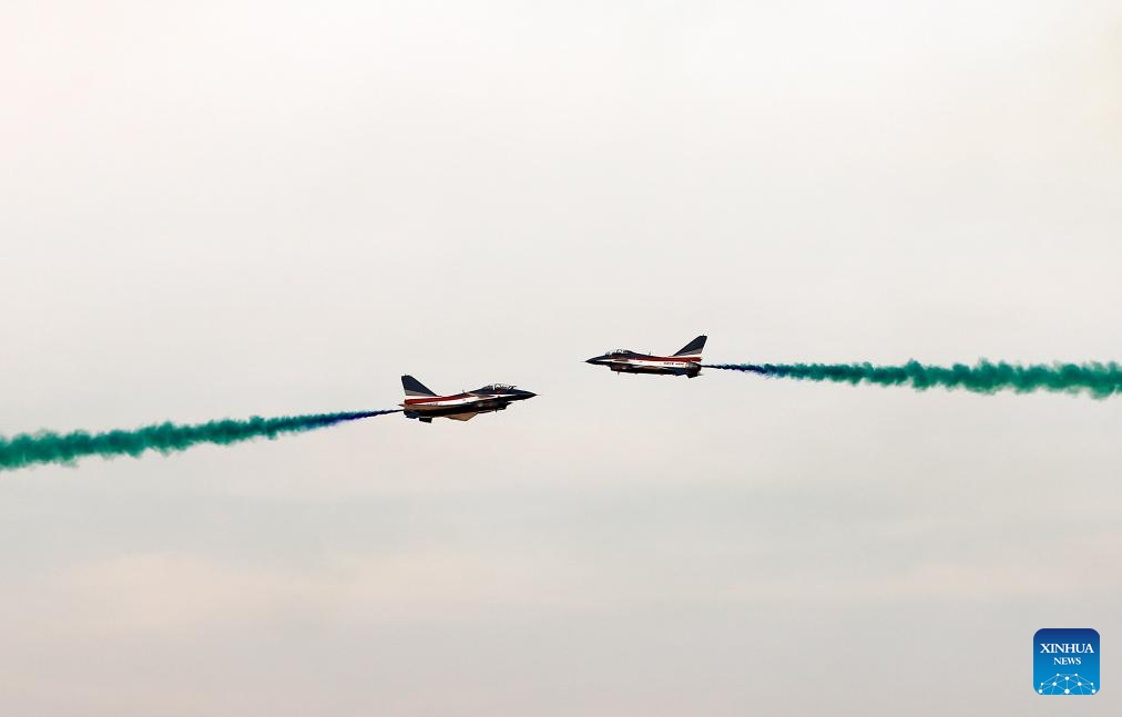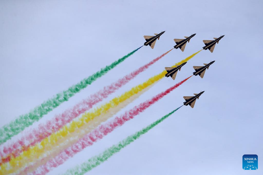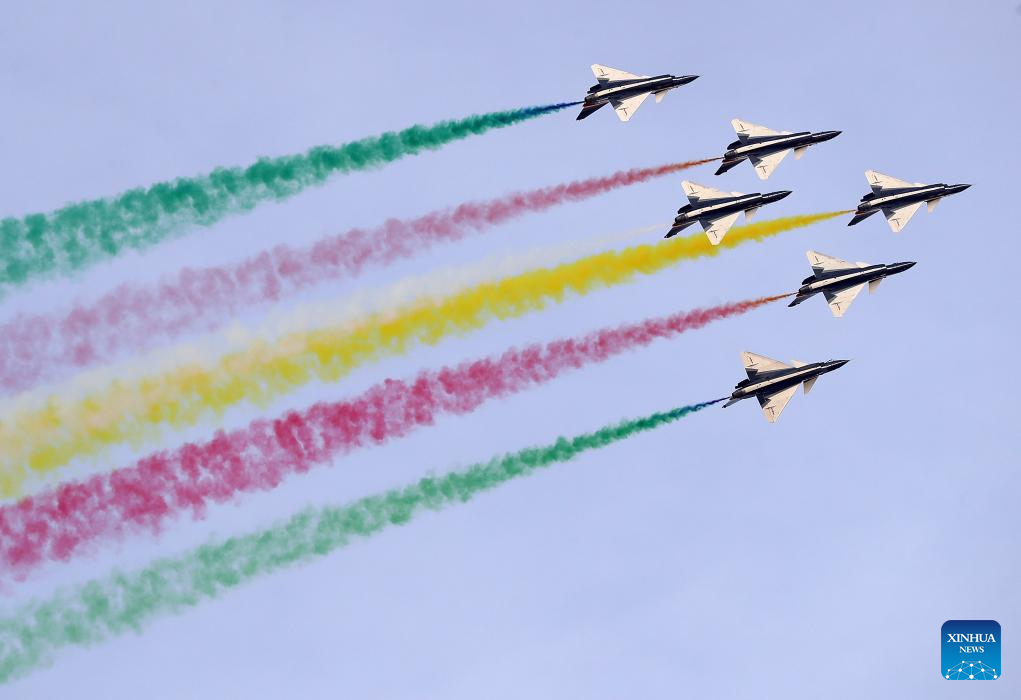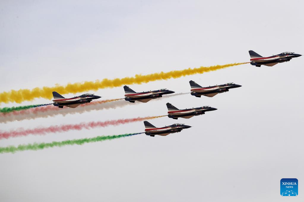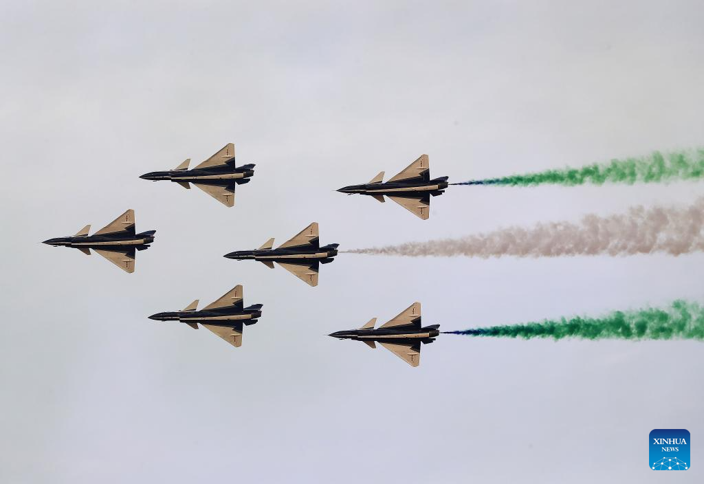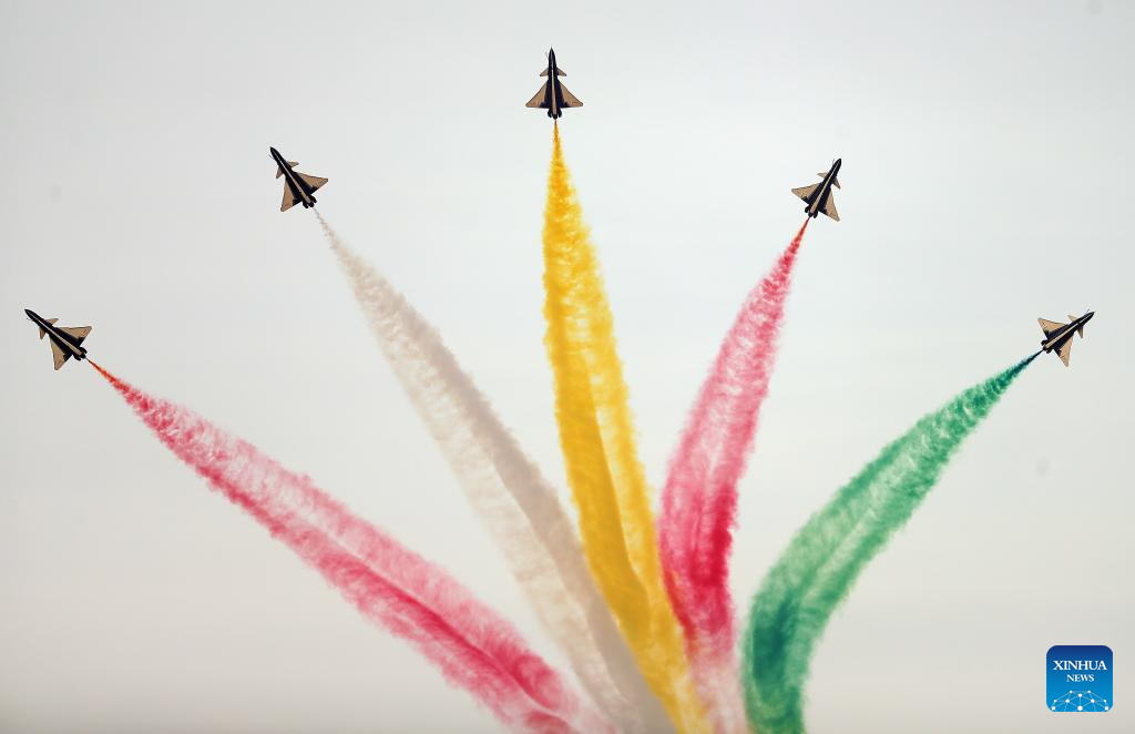 Aircraft of the Bayi Aerobatic Team of the Chinese People's Liberation Army (PLA) Air Force present an air show during the second edition of the World Defense Show in Riyadh, Saudi Arabia, on Feb. 5, 2024. (Xinhua/Wang Dongzhen)