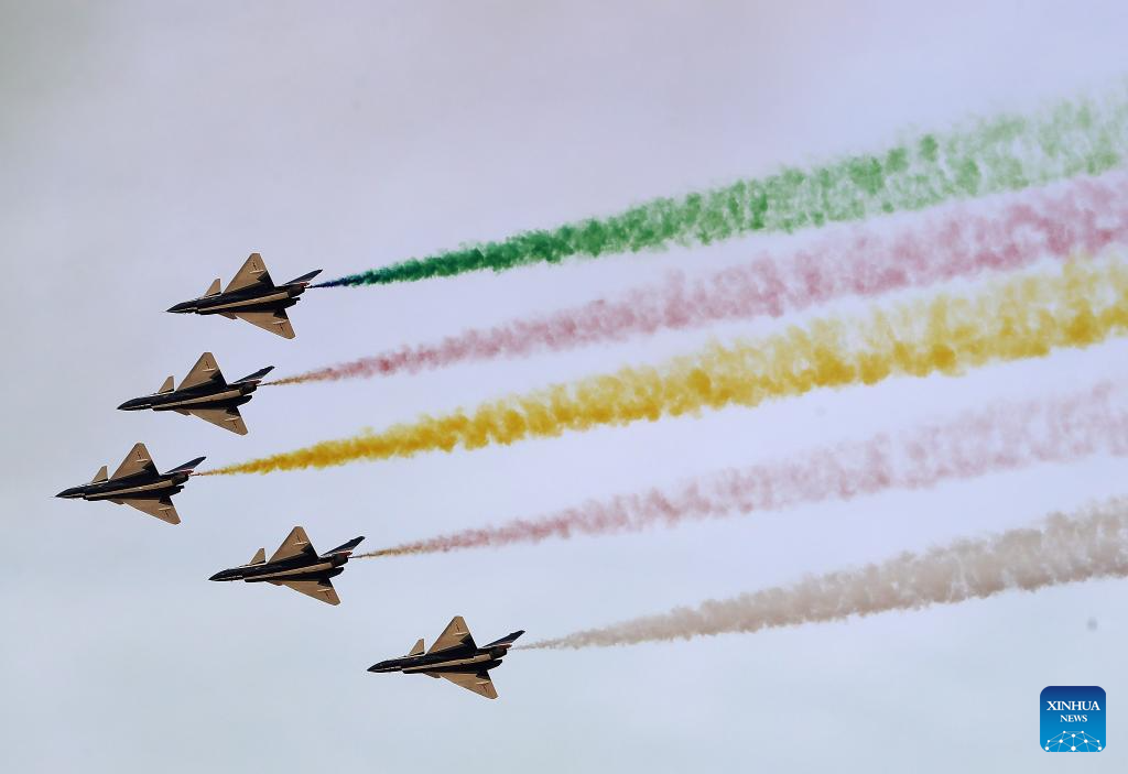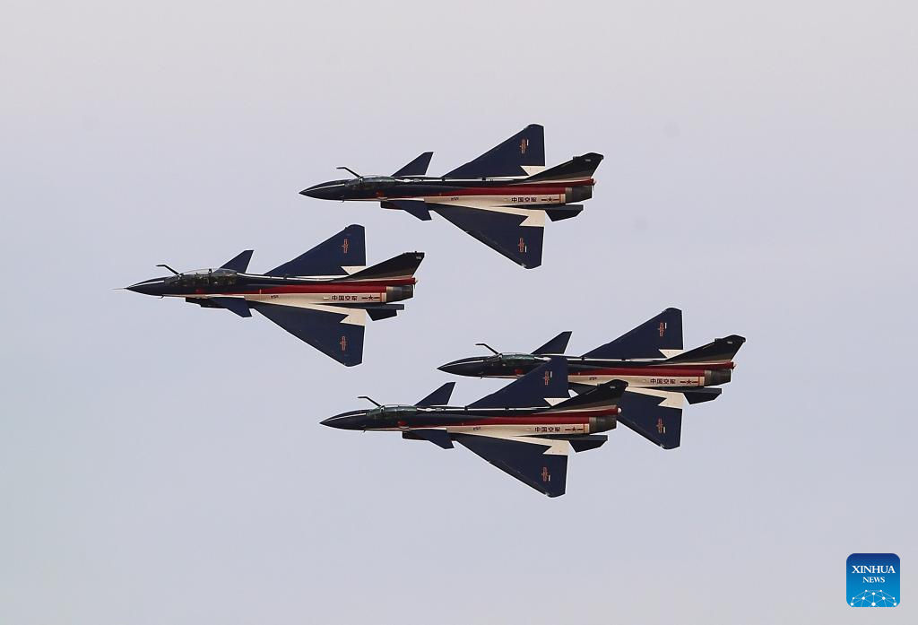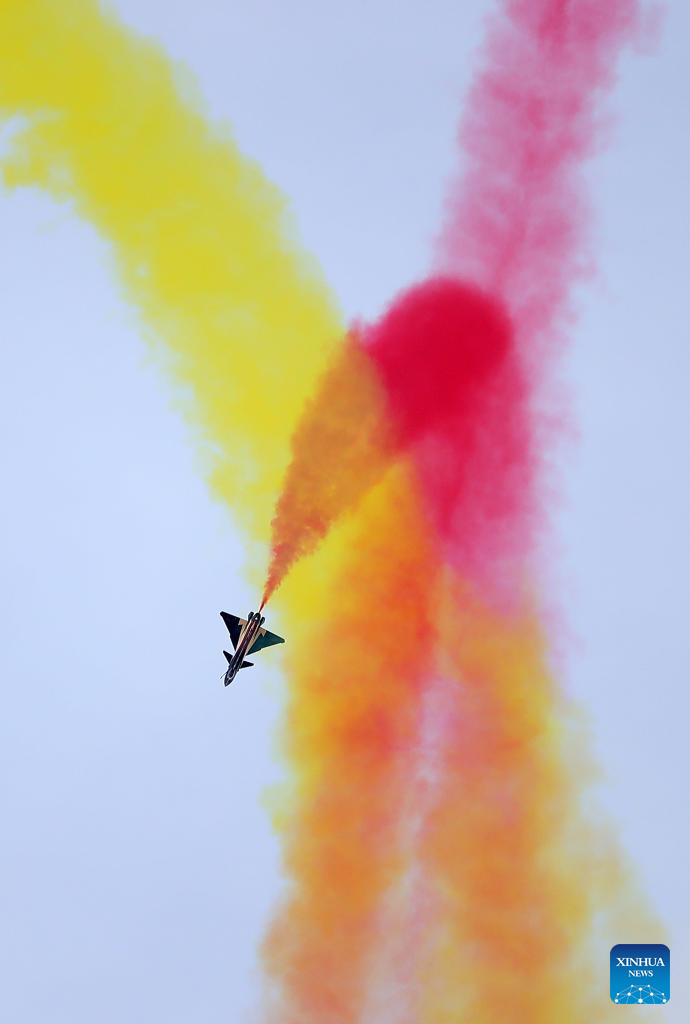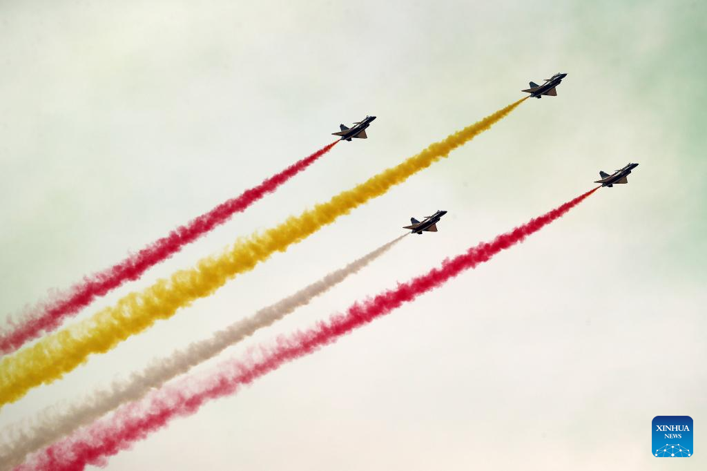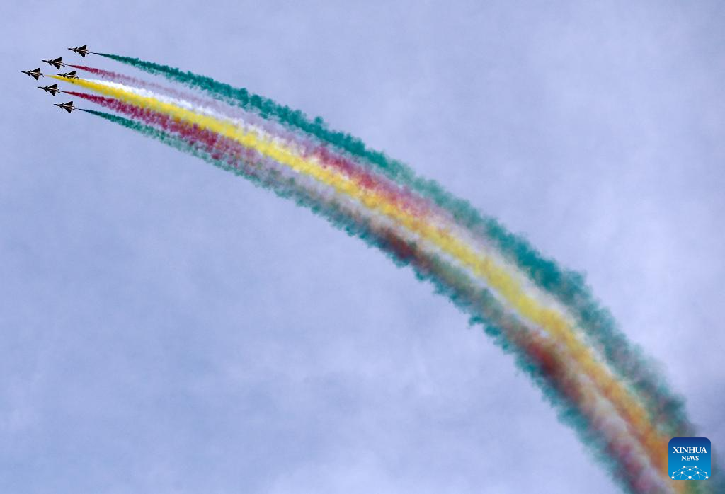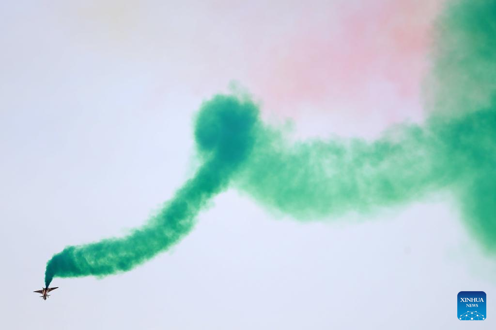 Aircraft of the Bayi Aerobatic Team of the Chinese People's Liberation Army (PLA) Air Force present an air show during the second edition of the World Defense Show in Riyadh, Saudi Arabia, on Feb. 5, 2024. (Xinhua/Wang Dongzhen)
