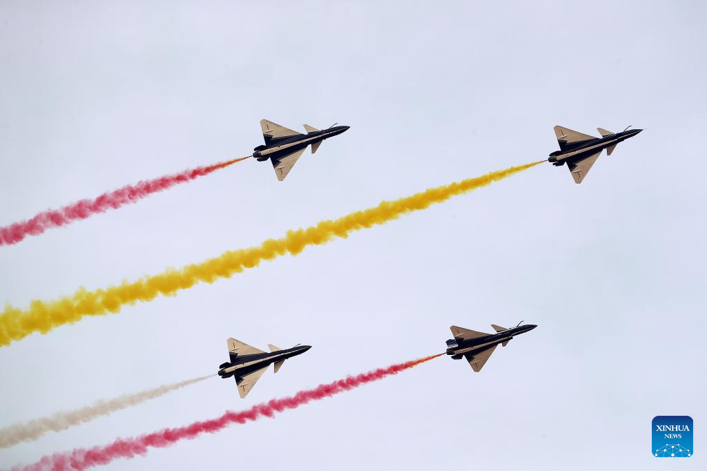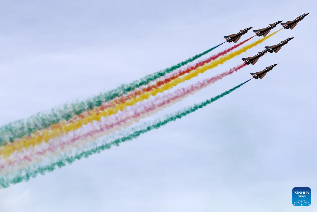 Aircraft of the Bayi Aerobatic Team of the Chinese People's Liberation Army (PLA) Air Force present an air show during the second edition of the World Defense Show in Riyadh, Saudi Arabia, on Feb. 5, 2024.?(Xinhua/Wang Dongzhen)