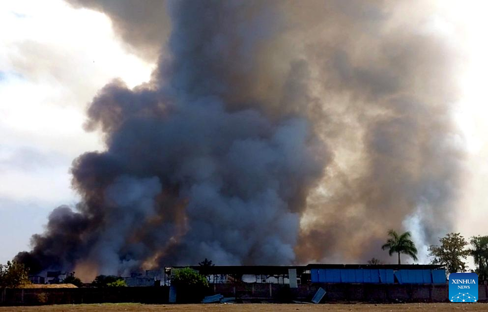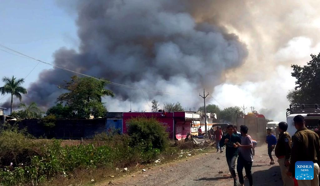 Smoke rises after a blast in a firecrackers manufacturing unit in the Harda district of Madhya Pradesh state, India, on Feb. 6, 2024. The death toll in Tuesday's multiple blasts in a firecrackers manufacturing unit in central India rose to 11, a police officer told Xinhua over the phone. (Str/Xinhua)