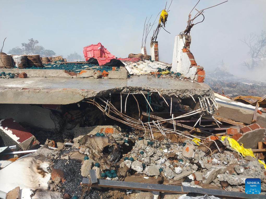 Photo taken on Feb. 6, 2024 shows debris of a firecrackers manufacturing unit after a blast in the Harda district of Madhya Pradesh state, India. The death toll in Tuesday's multiple blasts in a firecrackers manufacturing unit in central India rose to 11, a police officer told Xinhua over the phone. (Str/Xinhua)
