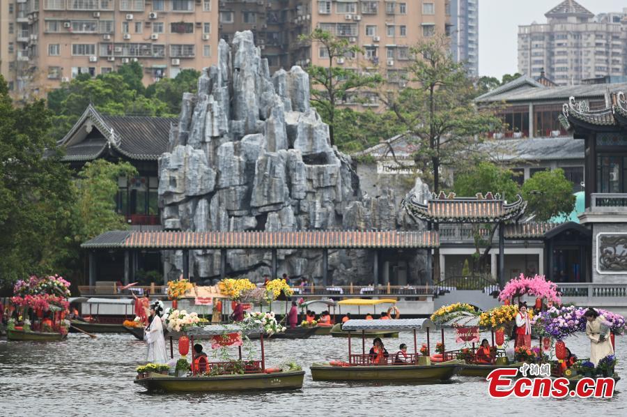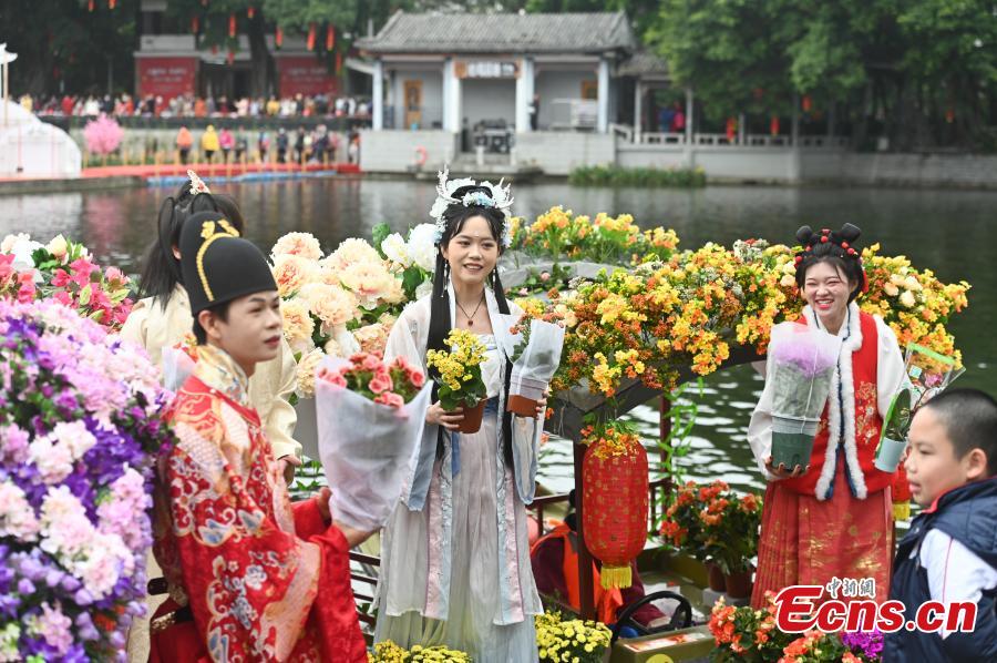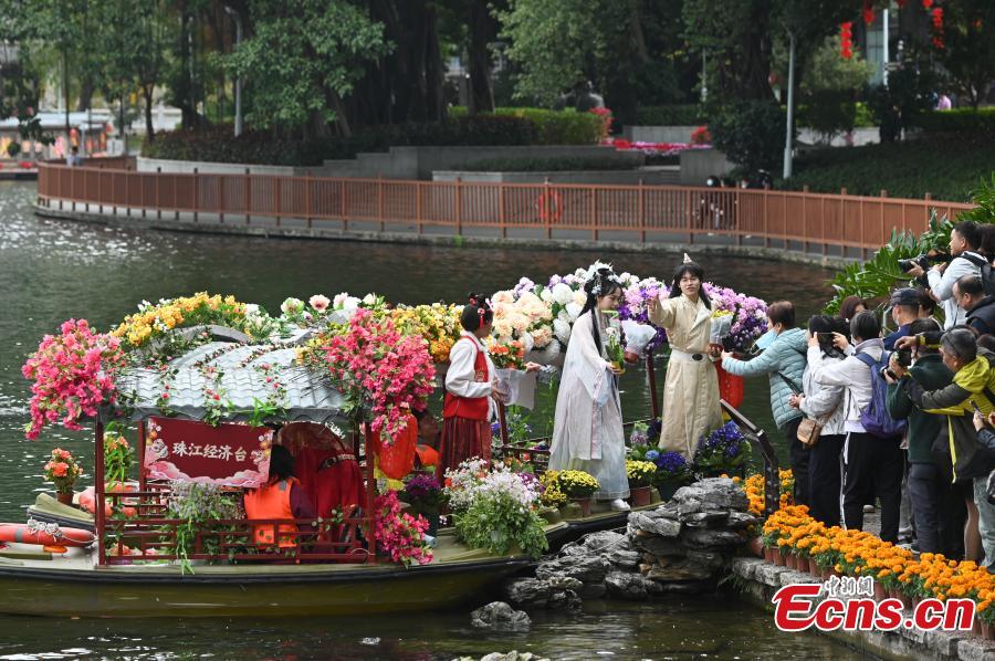 Women dressed in traditional Hanfu costumes take part in a cruise parade at the 14th floating flower market, a unique tradition during China's Spring Festival on Liwan Lake in Guangzhou, south China's Guangdong Province, Feb. 6, 2024. (Photo: China News Service/Chen Chuhong)