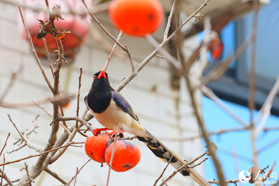 A red-billed blue magpie is seen on a persimmon tree in Xiamen, southeast China's Fujian Province. (People's Daily Online/Chen Bo)