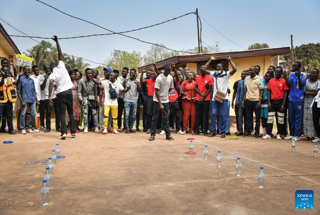 Students participate in a ring toss game during a cultural event at the Confucius Institute of Bangui University in Bangui, Central African Republic, Feb. 6, 2024. The Confucius Institute of Bangui University held a cultural event on Tuesday, celebrating the upcoming Chinese Lunar New Year, or the Spring Festival. (Xinhua/Han Xu)
